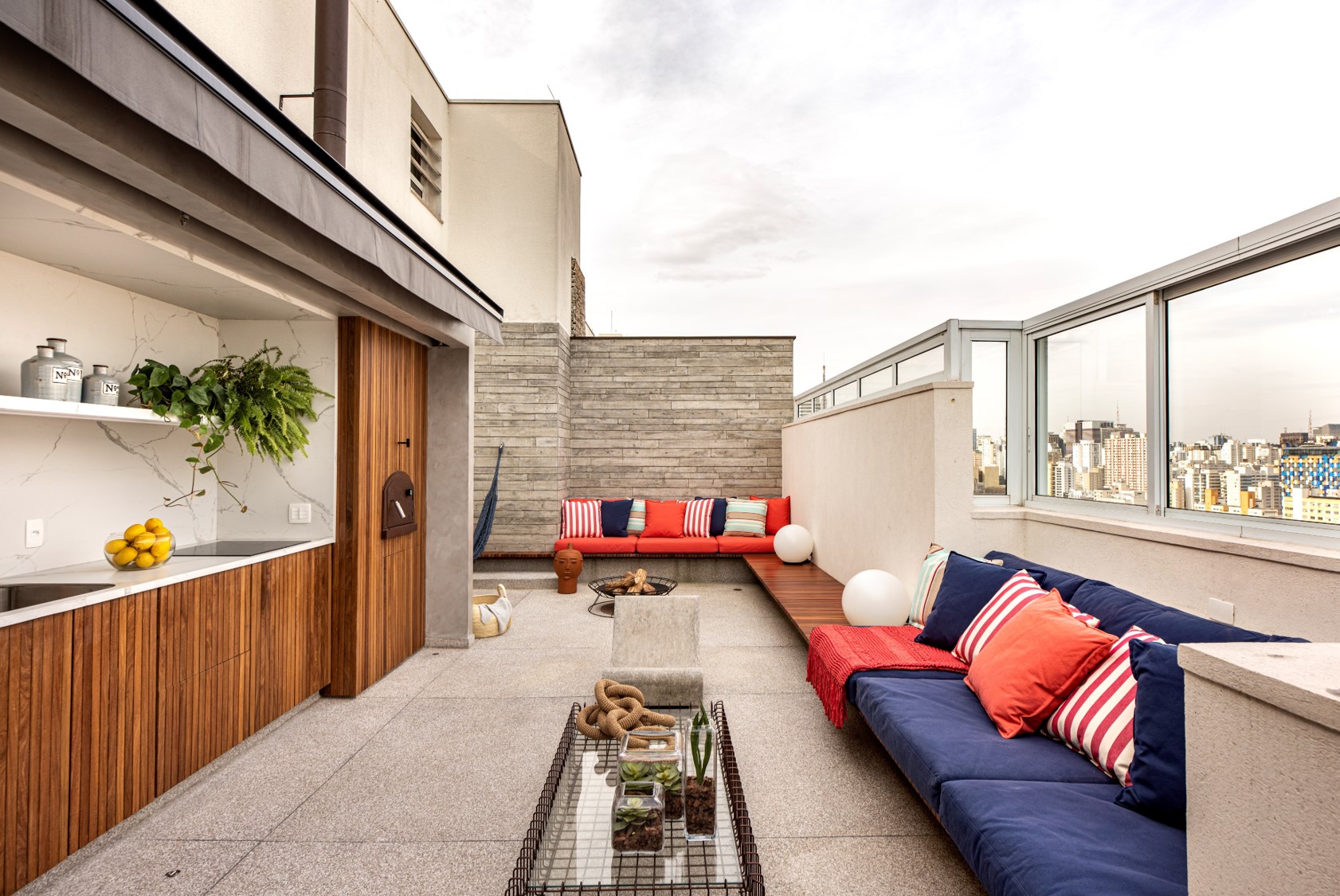 Uma área da casa toda pensada para curtir, em diferentes momentos. Assim é o terraço desta cobertura em Pinheiros, São Paulo, com projeto de Carol Pontes. A área toda integrada comporta diferentes momentos. Começando pela churrasqueira com forno de pizza, pensada na área de passagem com armários camuflados nas portas de madeira. Bem no meio do espaço a céu aberto, ela fica na área de passagem entre o espaço de refeições e o de descompressão. De um lado, a mesa de jantar com banco, para acomodar mais convidados, e muitas plantas; do outro, o sofá de canto com almofadões coloridos e a rede tornam o terraço gourmet um ponto para relaxamento.
