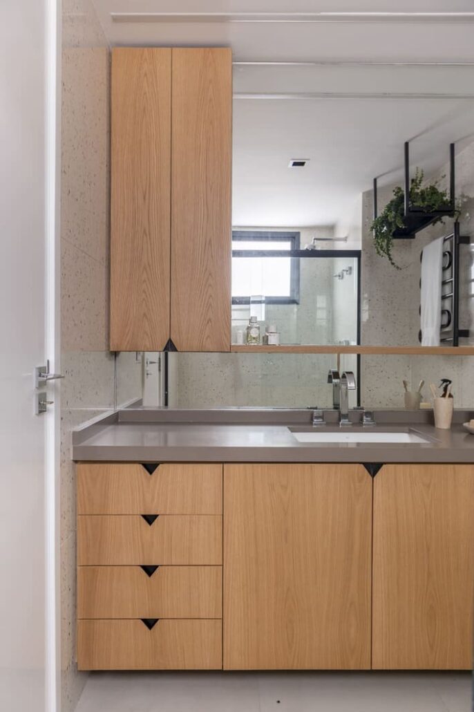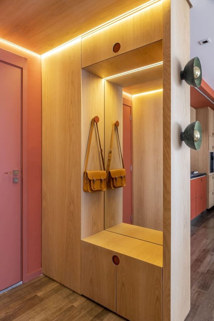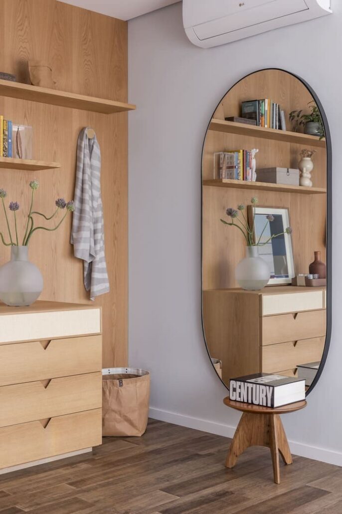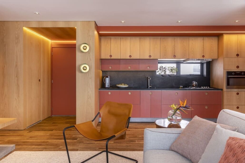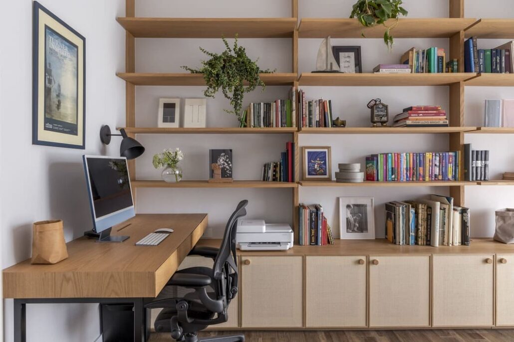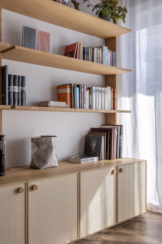 Trabalhamos com a marcenaria ao invés de paredes, para delimitar os espaços sem prejudicar a integração dos ambientes. Desenhamos a marcenaria para ser discreta e leve, flutuante, em harmonia com a gallery wall. Com isso, destacamos o que temos de mais valioso nessa morada: arte, histórias, risadas, vida vivida e celebrada.