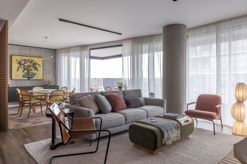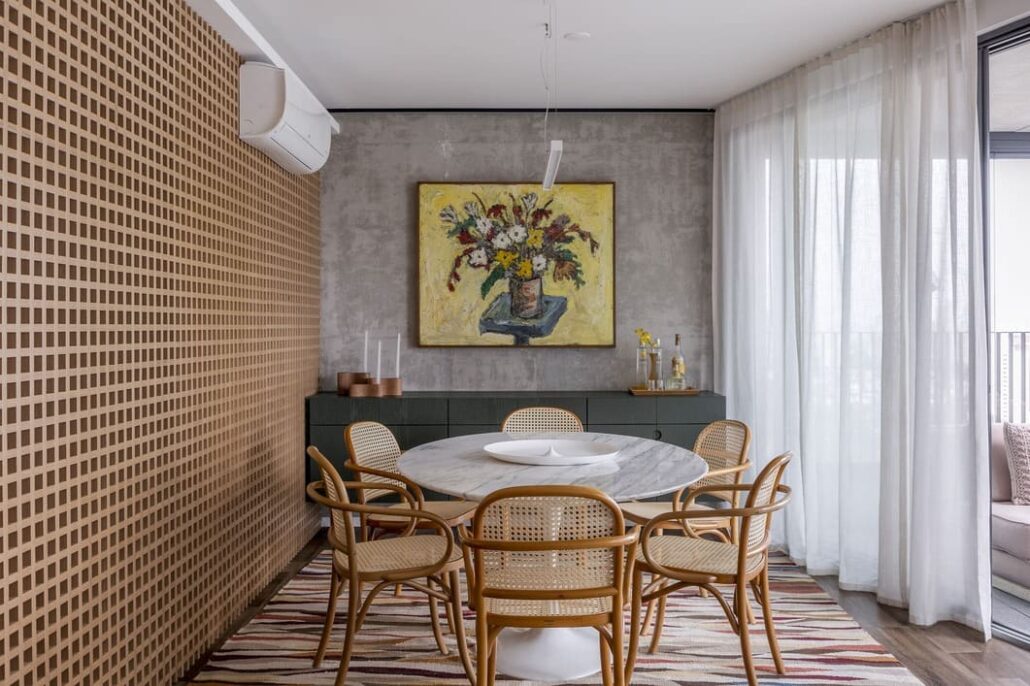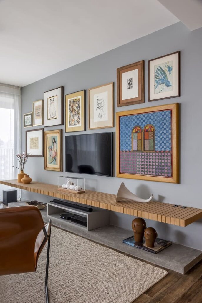 Um lar sem excessos, com elementos que tivessem significado: esse foi o pedido do casal. Com a partida dos filhos adultos, decidiram se mudar de uma casa maior para o apartamento na Vila Madalena. O imóvel tinha poucas paredes, e eles possuíam um extenso acervo de arte. Pensamos todo o projeto a partir desse acervo, e daí surgiu a ideia de trabalhar com uma gallery wall, compondo os quadros junto com a televisão.